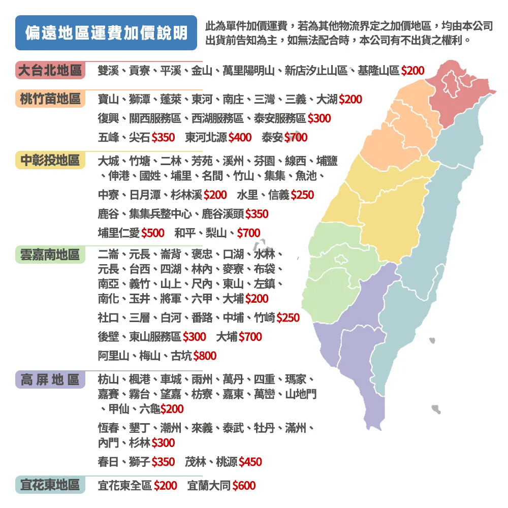 - 偏遠地區運費是由與本公司合作之物流核定,接受訂單後如核定為偏遠地區,將由客服與您聯絡確認加價運費。