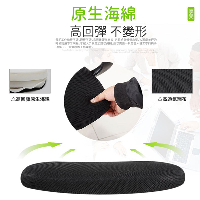 獨家搖椅式傾仰結構,搭配透氣網布椅背,午休平躺時頸部自然懸空不壓迫,辦公與休息模式10秒切換。